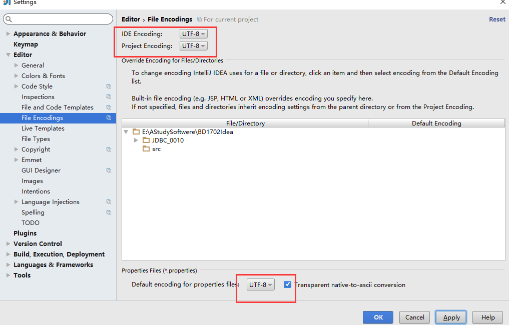 Transparent native-to-ascii conversion属性主要用于转换ascii,不然Properties文件的中文会被转码,IntelliJ IDEA除了支持对整个Project设置编码之外,还支持对目录、文件进行编码设置。