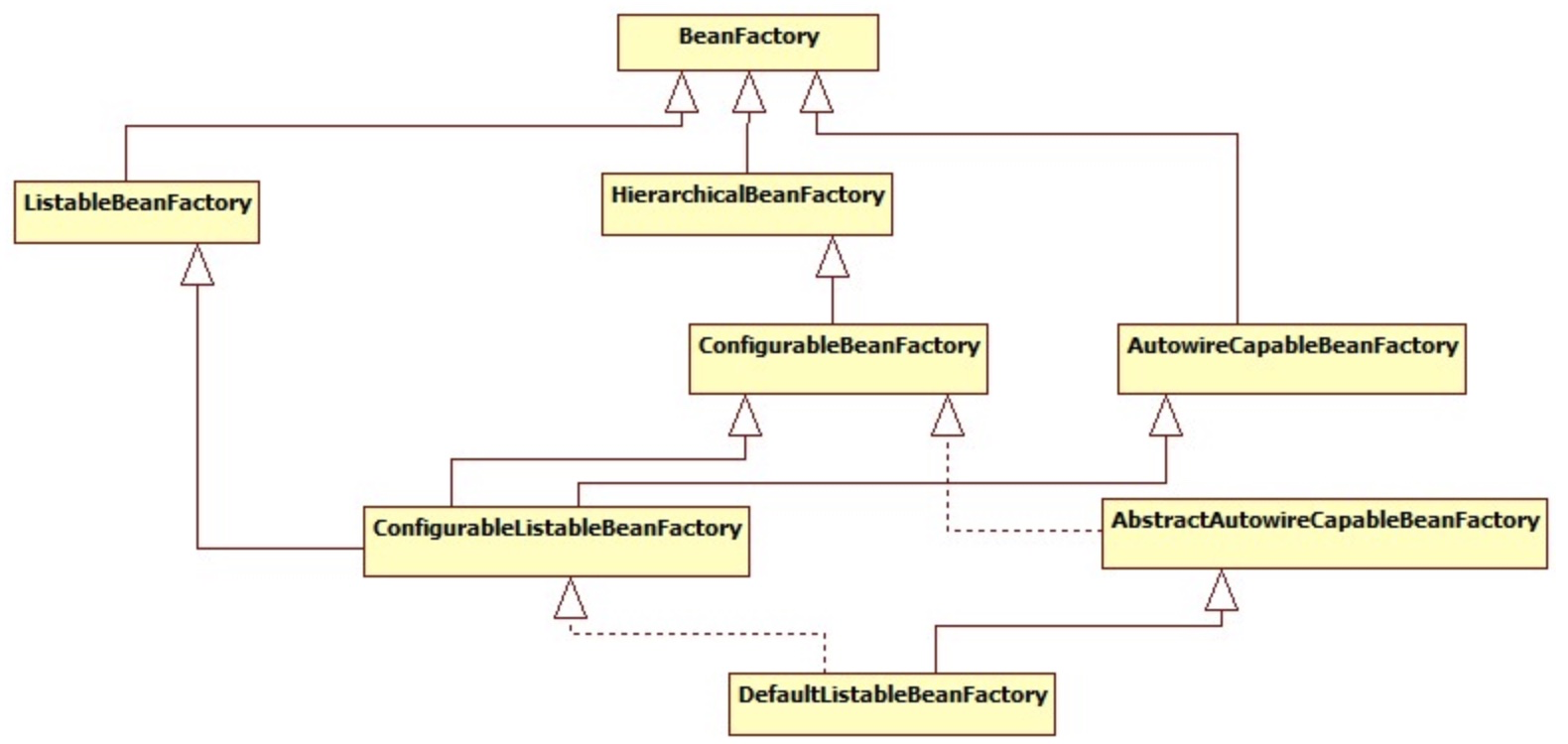 其中BeanFactory作为最顶层的一个接口类,它定义了IOC容器的基本功能规范,BeanFactory 有三个子类:ListableBeanFactory、HierarchicalBeanFactory 和AutowireCapableBeanFactory。但是最终的默认实现类是 DefaultListableBeanFactory,他实现了所有的接口。那为何要定义这么多层次的接口呢?其实每个接口都有他使用的场合,它主要是为了区分在 Spring 内部在操作过程中对象的传递和转化过程中,对对象的数据访问所做的限制。例如: