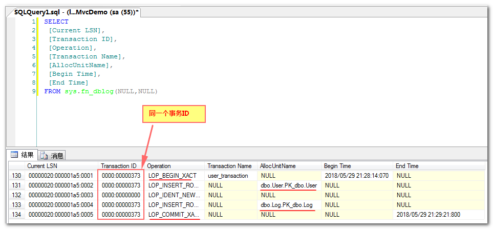 下面的代码后和对应在数据库中的事务日志,证实了两个Insert操作确实是在同一个事务里的。