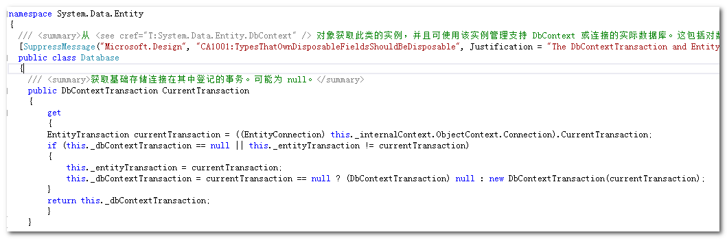 接着,摸清上方代码中的 ObjectContext.connection.CurrentTransaction 与 DbContext.Database.CurrentTransaction 的关系,我们就解决刚才的问题了:“是不是嵌套事务?”。通过反编译查看 DbContext.Database 的代码图下图所示(其实,github有EF的源码可以下载)。是不是发现它们其实就是同一个家伙,后者其实就是披了件马甲!