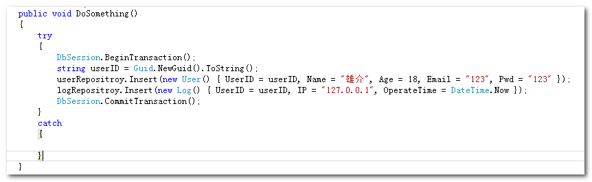 在service层主动调用 DbContext.Database.BeginTransaction(),这个方法会对EF上下文连接开启一个事务。OK,那么问题又来了,SaveChanges()本身也是事务的,BeginTransaction()又开启的事务,那不就形成嵌套事务了?接下来,让我们探讨一下这个问题。