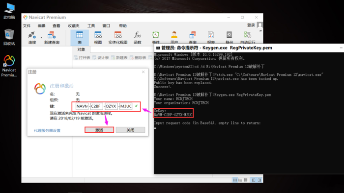 生成激活码将生成的激活码复制到 Navicat激活码输入框中,点击激活: