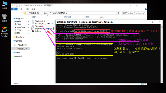 cd /d E:\Navicat Premium 12破解补丁;然后用Patch.exe给Navicat的主程序即navicat.exe打个补丁,换掉其中的公钥,执行