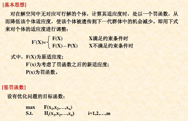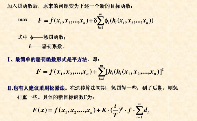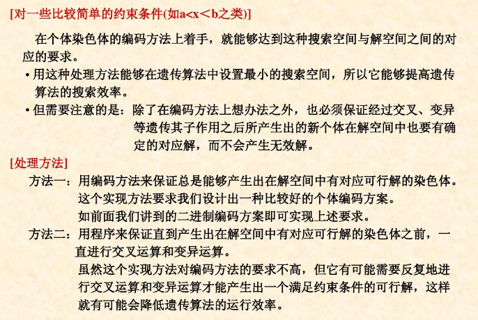 (5)约束条件处理方法:主要有三种,搜索空间限定法、罚函数法、可行解变换法。