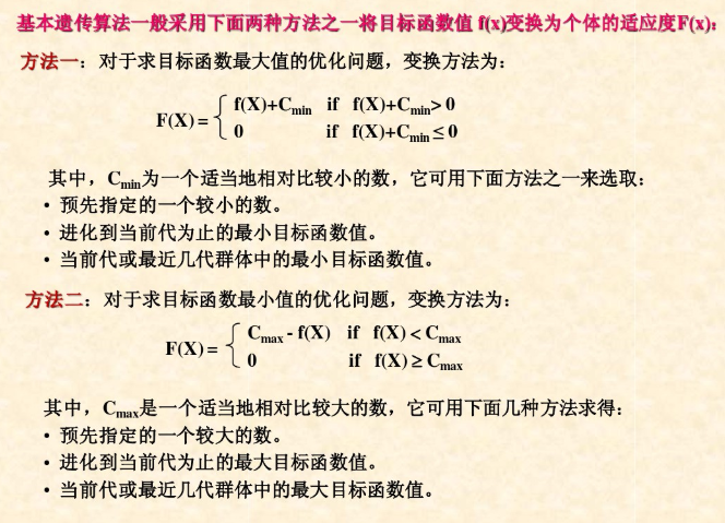 基本遗传算法按与个体适应度成正比的概率来决定当前群体中每个个体遗传到下一代群体中的机会多少。为正确计算这个概率,大多数时候要求所有个体的适应度必须为正数或零。因此,面对不同的问题,必须事先确定好 目标函数值到个体适应度之间的转换规则,特别是确定好当目标函数为负值时候的处理方法。