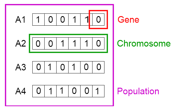 - 基因(Gene):时空之生物体某种性状(即遗传信息)的基本单位,表示可行解编码的分量。基因是串中的元素,基因用于表示个体的特征。例如有一个串S=1011,则其中的1,0,1,1这4个元素分别称为基因。它们的值称为等位基因(Alleles)。