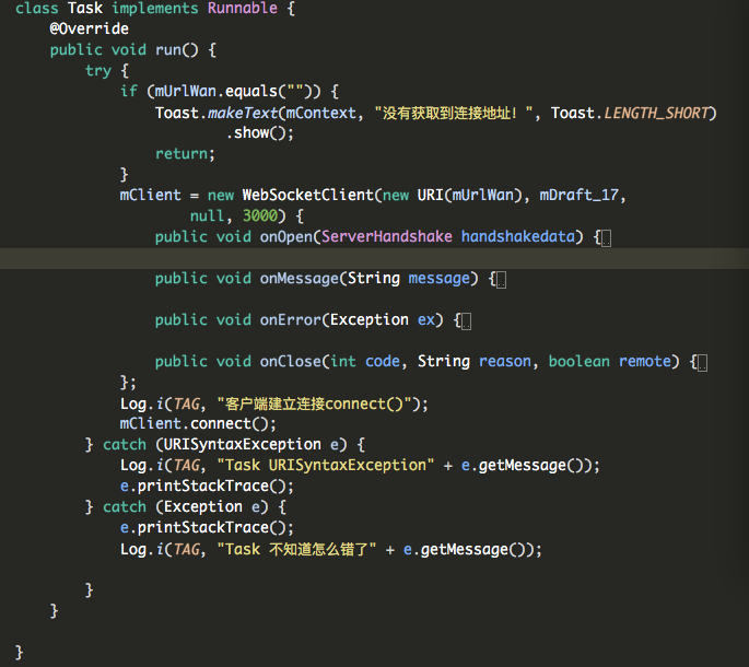 在runable中实例websocket对象,并在四个回掉函数中构建自己的业务逻辑,