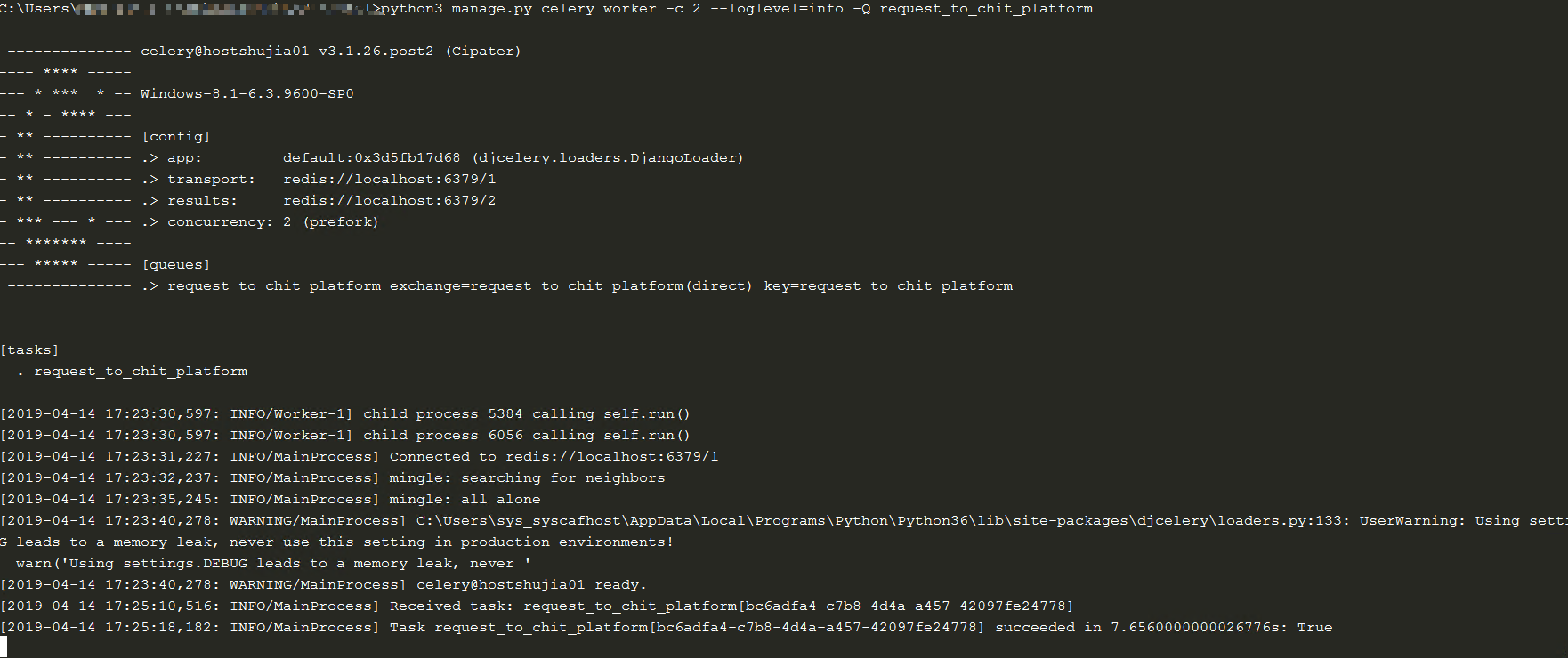python3 manage.py celery worker -c 10 --loglevel=info -Q request_to_chit_platform # 这样djcelery会帮助我们创建 request_to_chit_platform tasks的worker,并添加到 request_to_chit_platform 的队列 -c 指定worker数