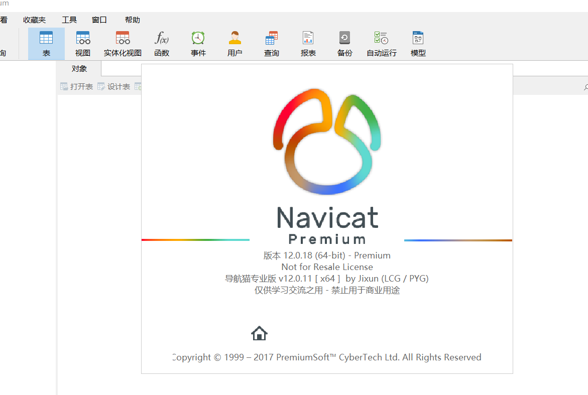 最后,打开Navicat Premium 12,点击菜单栏的帮助,然后选择关于,如果和下图所示相同,表明激活成功: