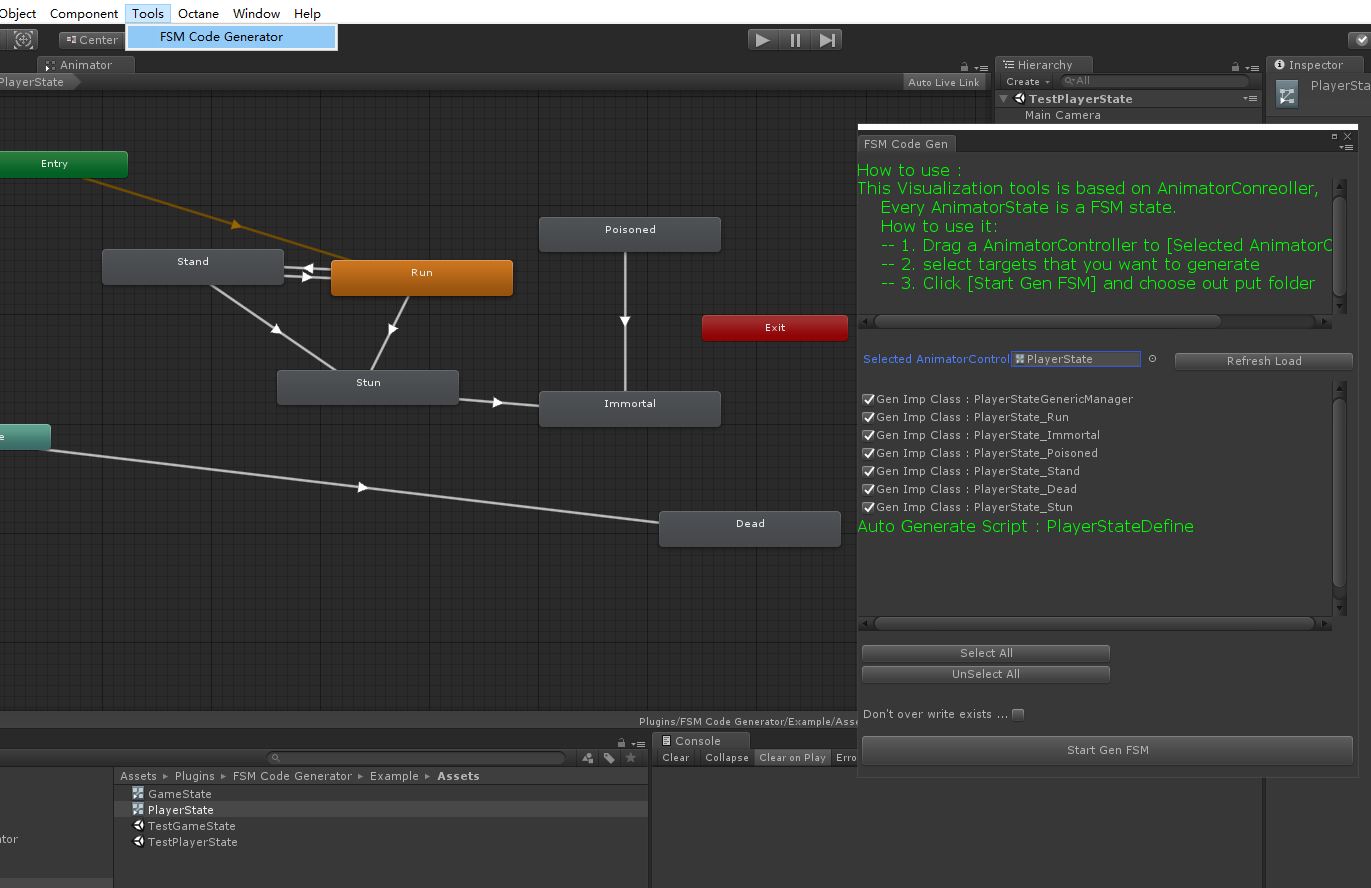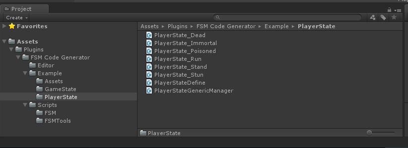 3. [Start Gen FSM] button is to start generate scripts. PlayerState and GameState were generated to [Assets/FSM Code Generator/Example/GameState] and [Assets/FSM Code Generator/Example/PlayerState] already.