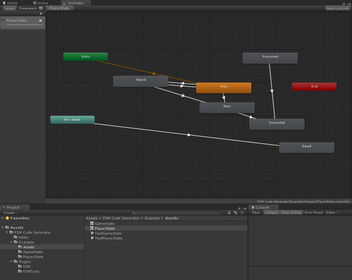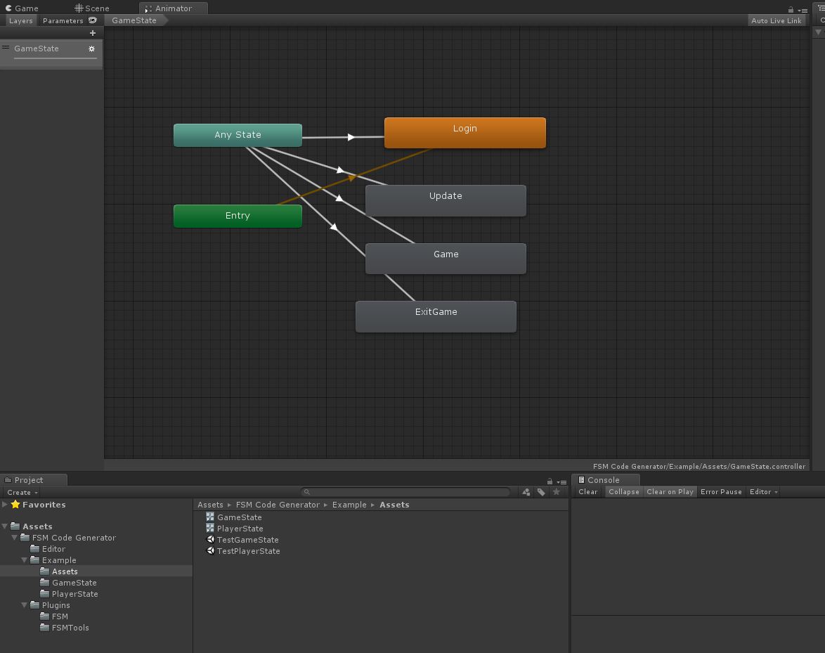 Double click the Example Animator Controller in folder [Assets/FSM Code Generator/Example/Assets] you can see GameState and PlayerState examples,