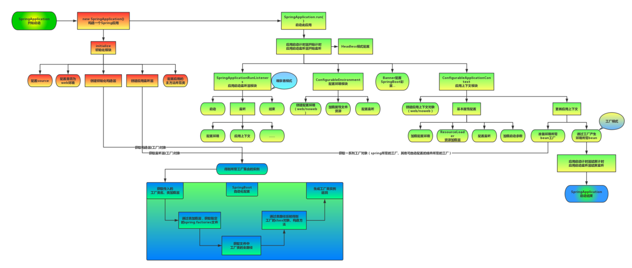 上图为SpringBoot启动结构图,我们发现启动流程主要分为三个部分,第一部分进行SpringApplication的初始化模块,配置一些基本的环境变量、资源、构造器、监听器,第二部分实现了应用具体的启动方案,包括启动流程的监听模块、加载配置环境模块、及核心的创建上下文环境模块,第三部分是自动化配置模块,该模块作为springboot自动配置核心,在后面的分析中会详细讨论。在下面的启动程序中我们会串联起结构中的主要功能。(摘自:SpringBoot启动流程解析)
