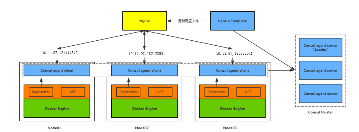 consul-template提供了一个便捷的方式从consul中获取存储的值,consul-template守护进程会查询consul服务,来更新系统上指定的任何模板,当更新完成后,模板可以选择运行一些任意的命令,比如我们这里用它来更新nginx.conf这个配置文件,然后执行nginx -s reload命令,以更新路由,达到动态调节负载均衡的目的。
