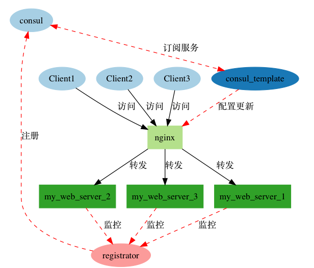 registrator来监控每个web server的状态。当有新的web server启动的时候,registrator会把它注册到consul这个注册中心上。由于consul_template已经订阅了该注册中心consul上的服务消息,此时consul注册中心会将新的web server信息推送给consul_template,consul_template则会去修改nginx.conf的配置文件,然后让nginx重新载入配置以达到自动修改负载均衡的目的。同样当一个web server挂了,registrator也能感知到,进而通知consul做出响应。