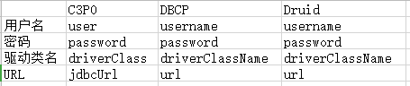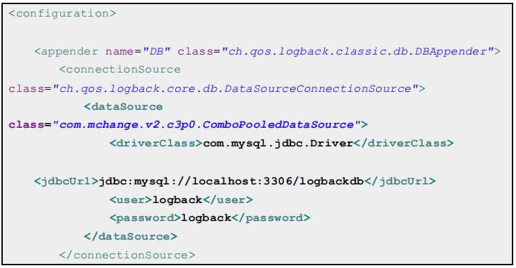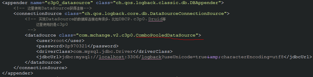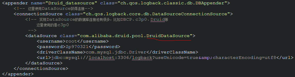由于DataSource有不同的实现,比如Druid、c3p0、dbcp数据源等。每一种数据源对用户名与密码驱动等属性的命名可能不一致,因此导致配置文件的标签有可能不一样。下面列举一下Druid与c3p0类型数据源的appenderde的配置。