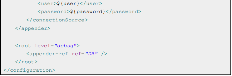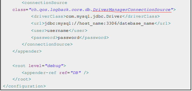 通过配置Druid类型数据源的DBAppender与c3p0类型数据源的DBAppender以及dbcp类型数据源的DBAppender可以发现他们有以下区别:存储用户名、驱动、资源定位符使用的标签是不同的。