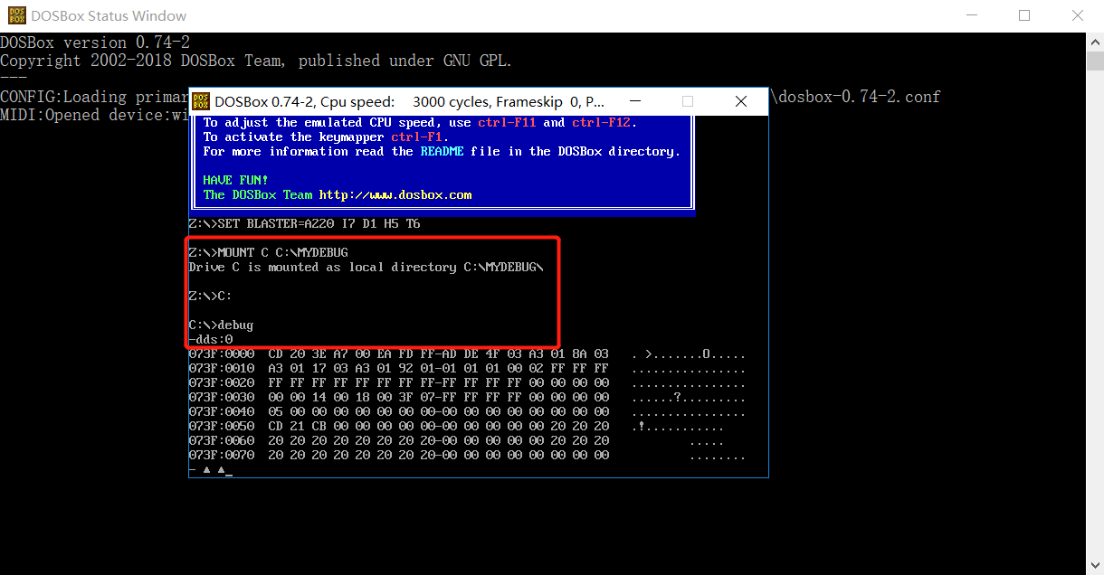 (1) 下载DOSBox,和debug.exe,直接上百度搜索就能下载。