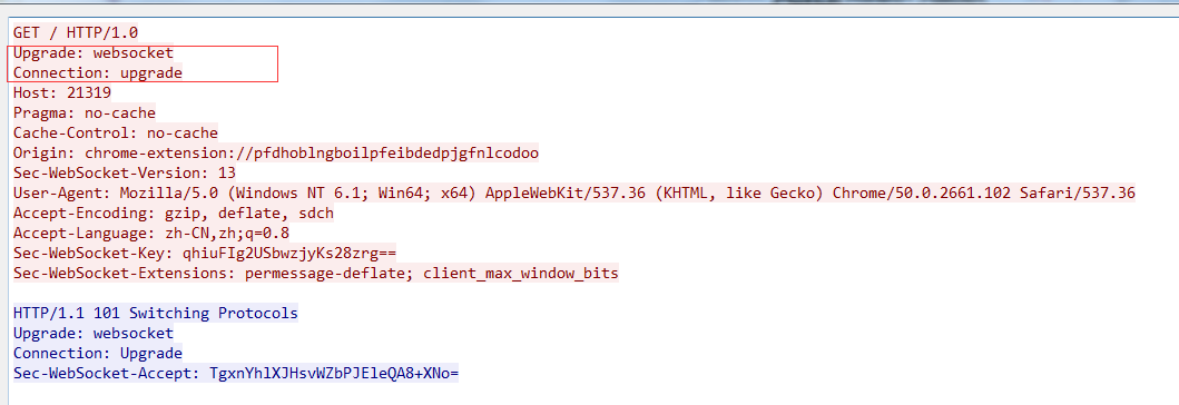 可以看到,客户端发起的WebSocket连接报文类似传统HTTP报文,Upgrade:websocket参数值表明这是WebSocket类型请求,Sec-WebSocket-Key是WebSocket客户端发送的一个 base64编码的密文,要求服务端必须返回一个对应加密的Sec-WebSocket-Accept应答,否则客户端会抛出Error during WebSocket handshake错误,并关闭连接。