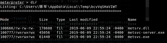 (2)命令运行成功后会在C:WindowsTEMP目录下新建随机名称的文件夹,里面生成3个文件(metsvc.dll、metsvc-server.exe、metsvc.exe)。