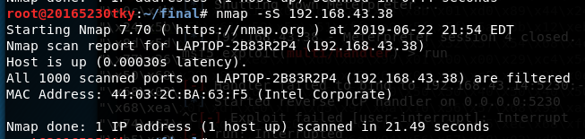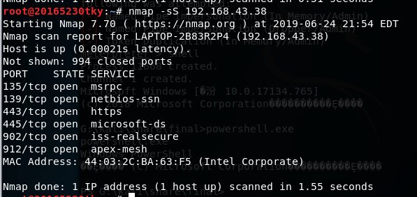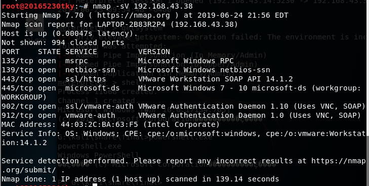 nmap -sV 192.168.43.38扫描物理机,-sV是参数,命令nmap对目标进行端口对应相关应用程序进行扫描
