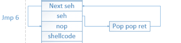 seh : seh处理程序地址部分填入的是一个指向pop pop ret 这样连续三条指令的一个地址,这样填充原因是,在异常出现时,先保存当前栈定,然后系统会在栈里面压入两个参数,所以两个pop是pop出来系统压的参数,然后ret到nseh的位置,接着开始执行指令,然后参考上面nseh的数据介绍就可以。