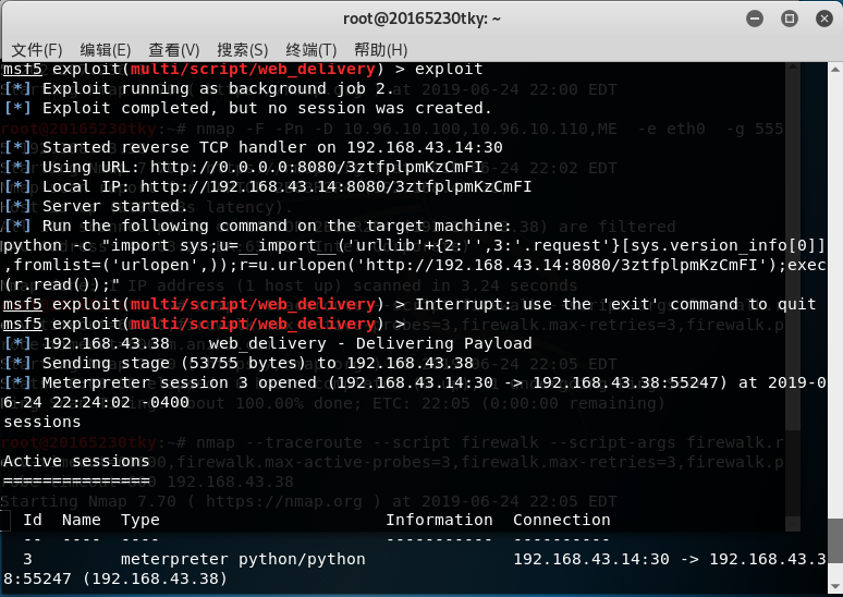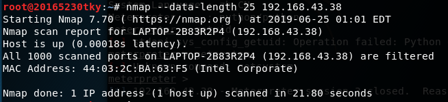 nmap --data-length 25 192.168.43.38命令进行随机数据长度尝试