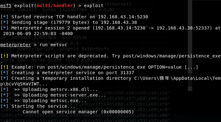- Meterpreter的shell运行在内存中,目标重启就会失效,如果管理员给系统打上补丁,那么就没办法再次使用exploit获取权限,所以需要持久的后门对目标进行控制。 Msf提供了两种后门,一种是metsvc(通过服务启动),一种是persistence(支持多种方式启动)。