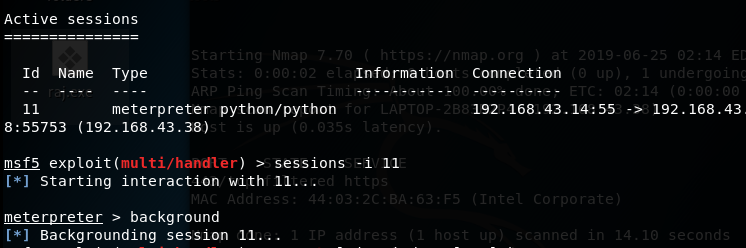 (1)首先需要在meterpreter下执行background命令让当前会话保存到后台。