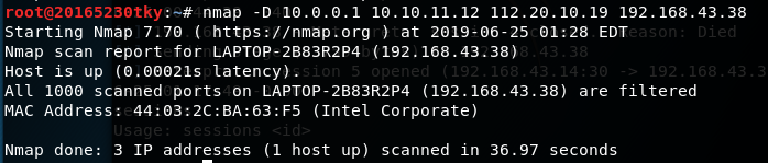 这种类型的扫描是非常隐蔽且无法察觉。目标由多个假冒或伪造IP地址进行扫描。这样防火墙就会认为攻击或扫描是通过多个资源或IP地址进行,于是就绕过了防火墙。 这实际上在目标看来是由多个系统同时扫描,这使得防火墙更难追查扫描的来源。