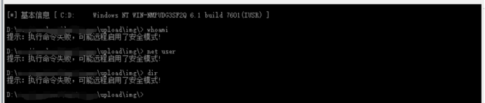 拿到shell后进入终端查看权限,但却发现执行命令失败,可能远程启用了安全模式