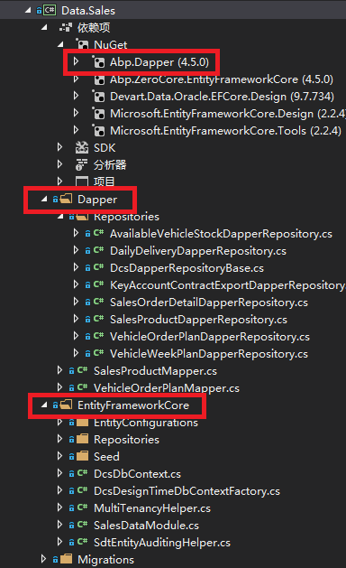 这个不做过多的解释,通过Nuget 包管理器或者通过程序包管理控制台来添加Abp.Dapper的引用,在我们实际的项目中整个类库的结构如下图所示,包含Dapper和EntityFrameworkCore两种方案。