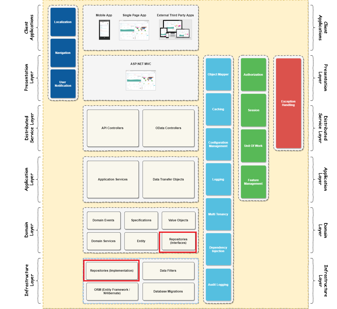 有没有对这张图很熟悉,这个就是用于介绍ABP N层架构的示意图,红框标注的就是具体的结构中的接口定义和实现,这两者的定义和实现分别是处于不同的层中,一个属于Domain Layer中而具体的实现位于Infrastructure Layer中,一层定义接口,而另外一层则定义具体的实现,有了这个你是不是对整个ABP的架构有了更深入的理解呢?