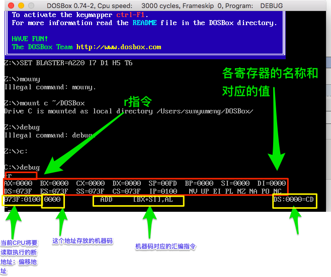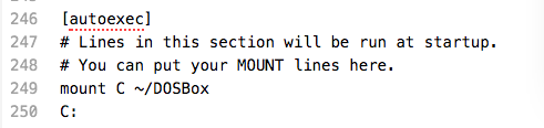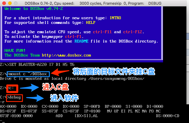 然后DOSBox界面,输入mount c ~/DOSBox 。