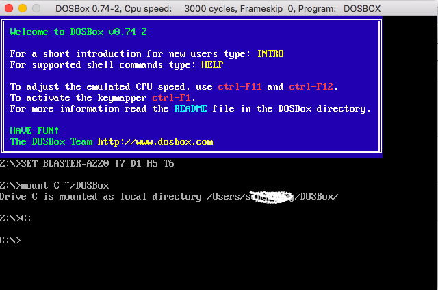 - mount了之后,输入c:回车,就可以进入~/DOSBox路径下了。