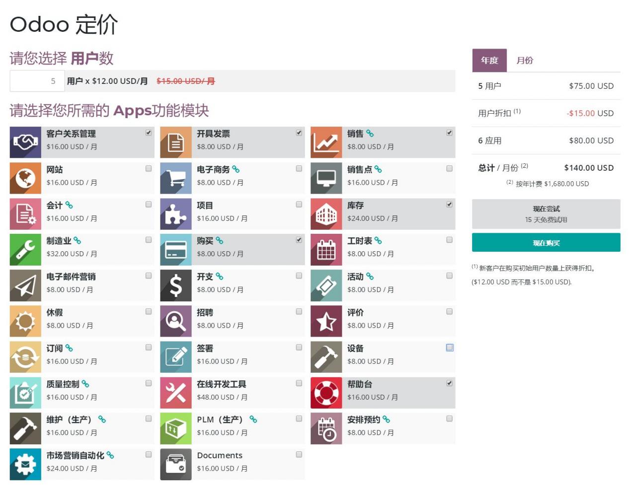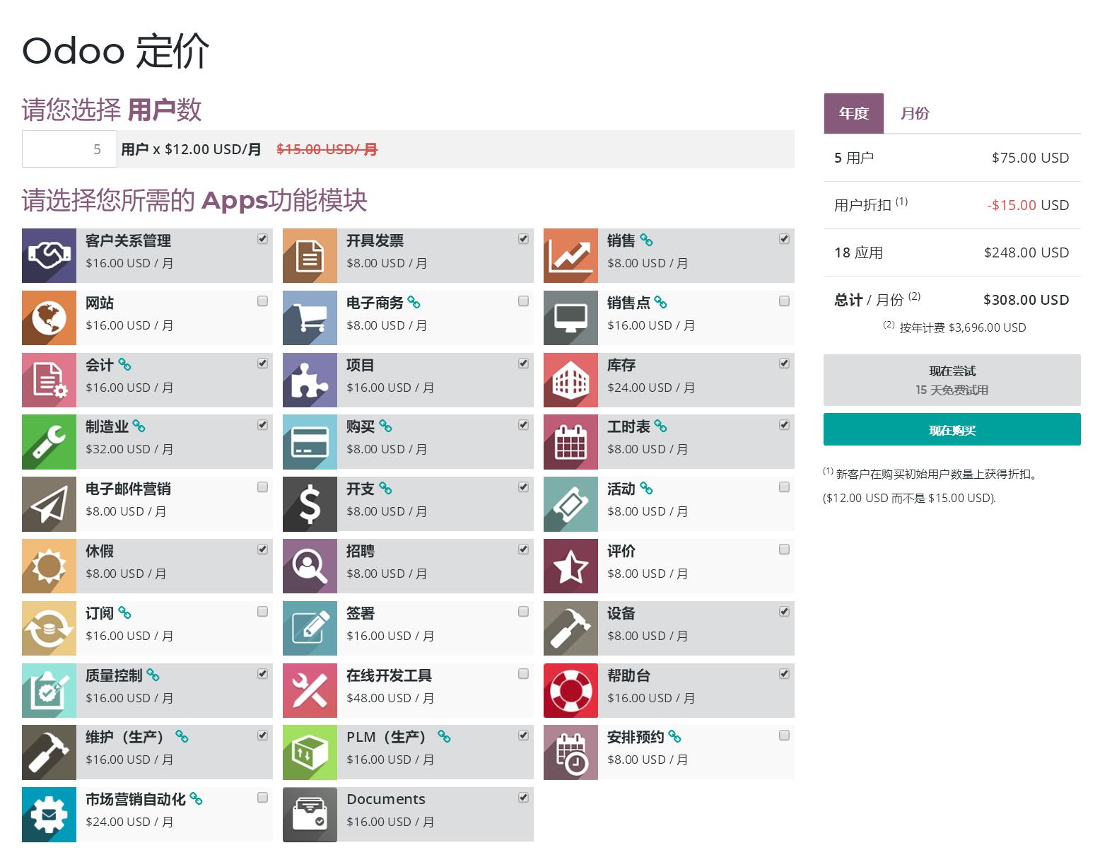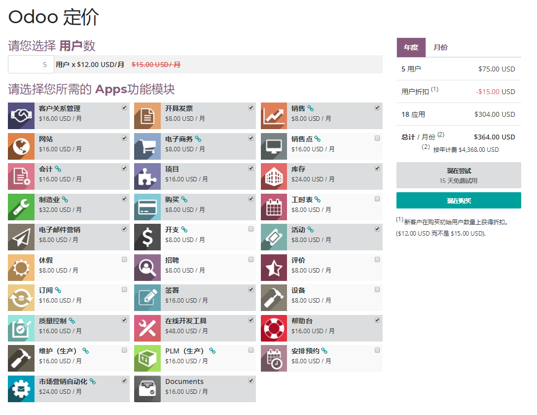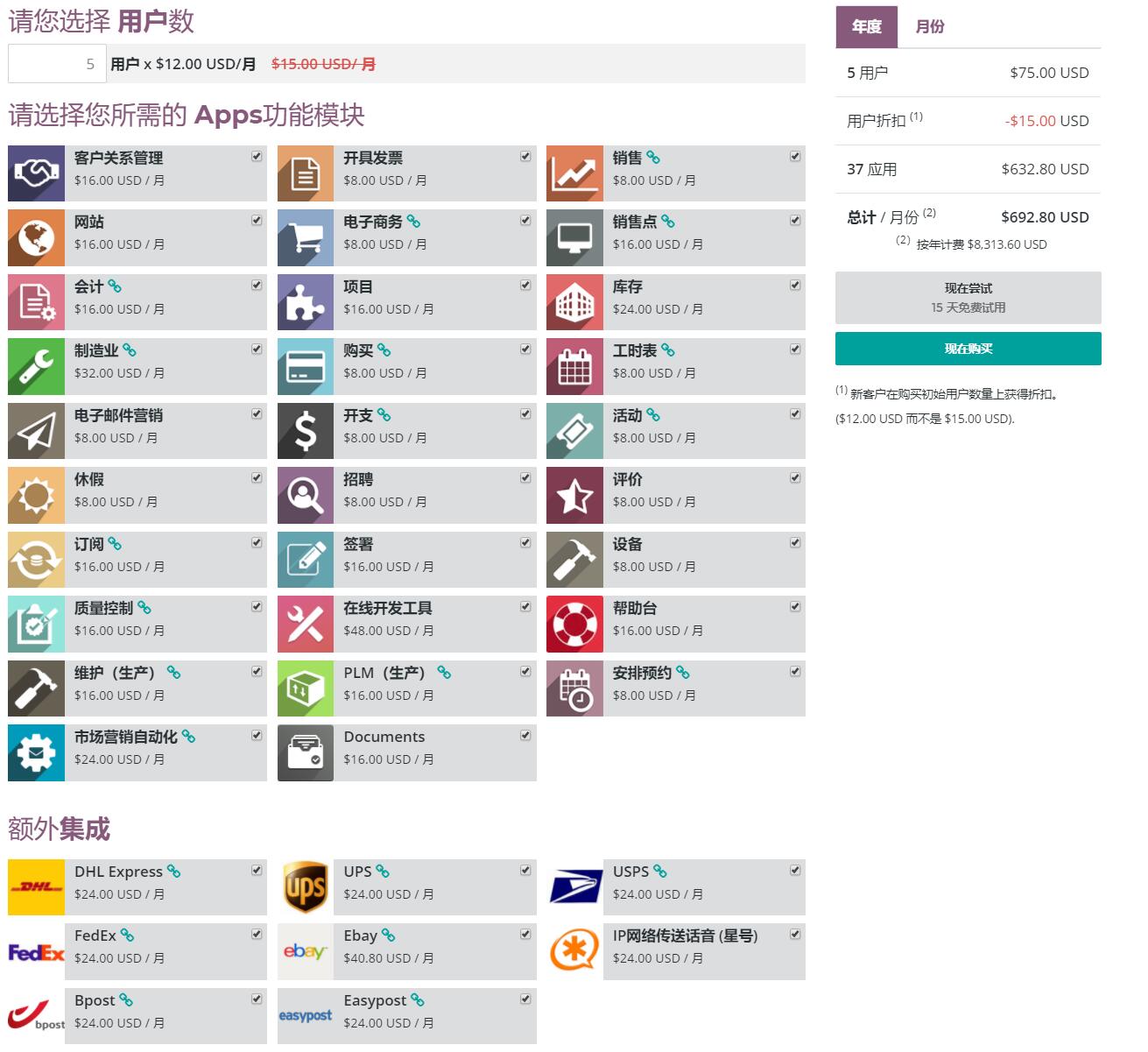 Odoo / Ps Cloud12企业版全功能套装,$8313每5用户每年,约人民币¥58200
