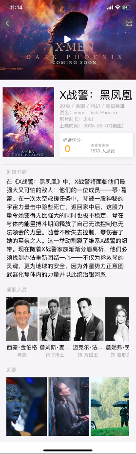 第二页为影片的详情页,主要围绕特定的影片把其中的内容渲染在页面,包括视频播放,封面与海报,基本介绍演职人员以及剧照,布局使用flex构建,当然页面也包含使用了一些其他的api,比如视频操作图片预览等。
