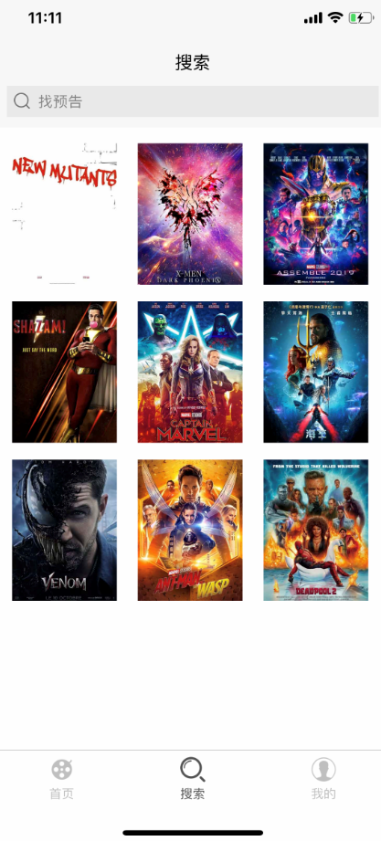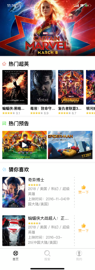 第一页为产品首页,分为4个部分,轮播图,横向滚动热门超级英雄,以及热门预告片和猜你喜欢,其实视频可以播放,猜你喜欢每次下拉刷新都会展示随机的5部预告。