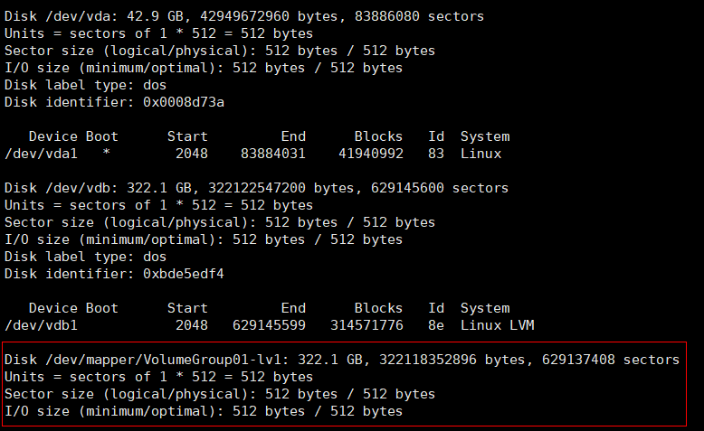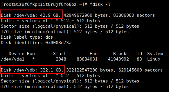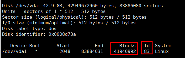 2、同时你也可以观察到分区信息,40G的硬盘已经分了一个区vda1,大小(Blocks)是41940992,分区类型83,linux分区类型。而vdb磁盘下并没有任何分区信息,证明还没有分区。