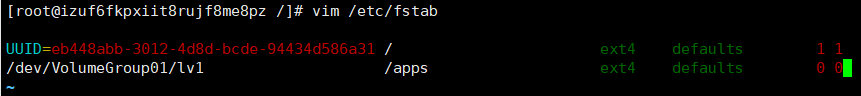 18、输入 /dev/VolumeGroup01/lv1 /apps ext4 defaults 0 0