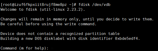3、因为我们要分的是第二块300G的硬盘,所以我们输入 fdisk /dev/vdb,出来如下界面的时候,就可以继续输入命令进行操作了