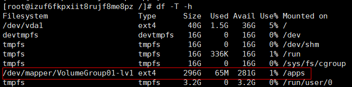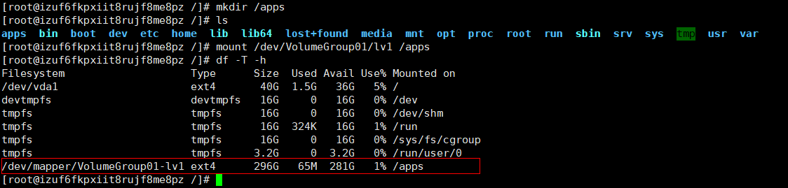 19、重启机器后,可以看到lv1分区已经顺利挂载到了apps目录下,打完收功,大功告成!