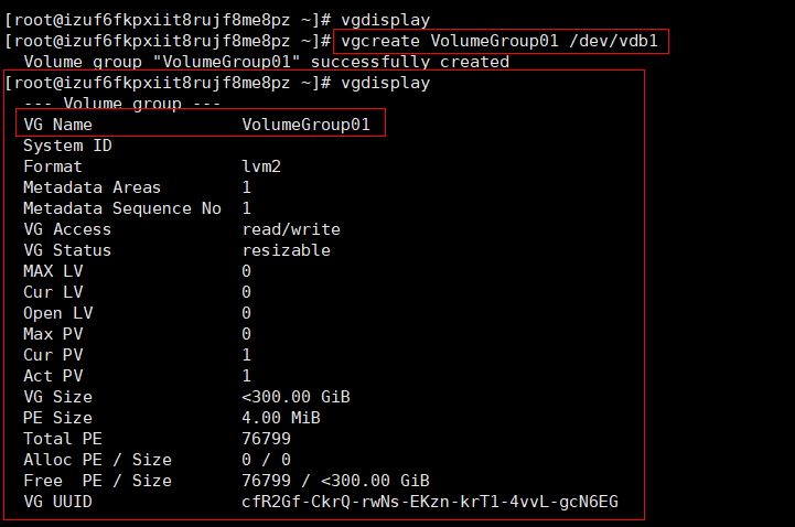 13、使用 vgcreate 来创建卷组,创建后使用vgdisplay来查看创建的卷组信息