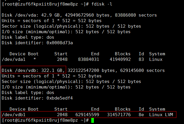 10、我们再来用 fdisk -l 查看下磁盘信息,可以看到硬盘vdb下已经多了一个分区vdb1了,并且分区格式是8e Linux LVM