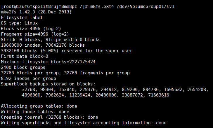 16、使用 mkfs.ext4 来格式化 lv1