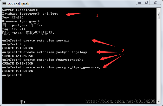 如,在sql或psql console中输入’create extension postgis;’