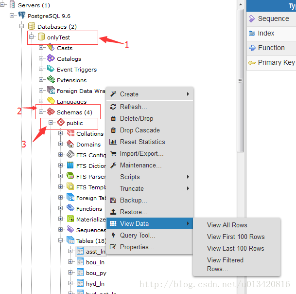 3. 在Schemas下选择public 然后展开找到Tables展开并找到我们需要的table,右击选择View Data 即可展示数据。