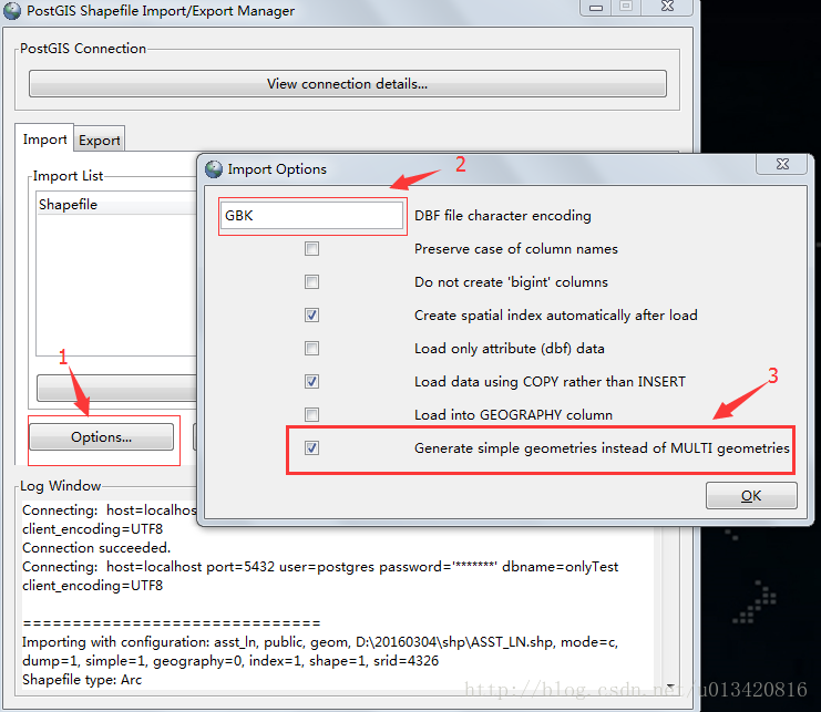 4.3在Log Window中出现Connectionsucceeded说明链接成功。就可以进行导入文件操作了。